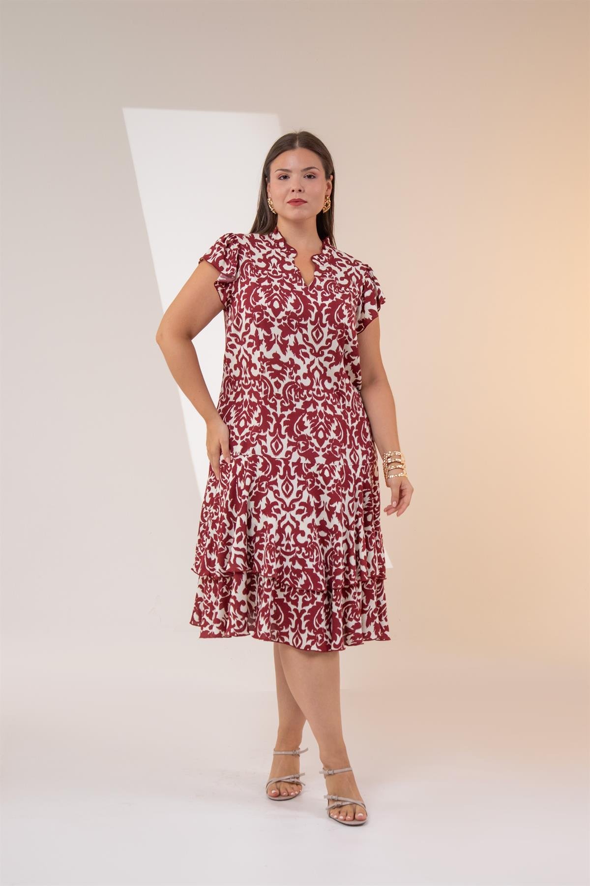 Büyük Beden 3330483 Eteği KatlI-Volanlı Elbise Bordo
