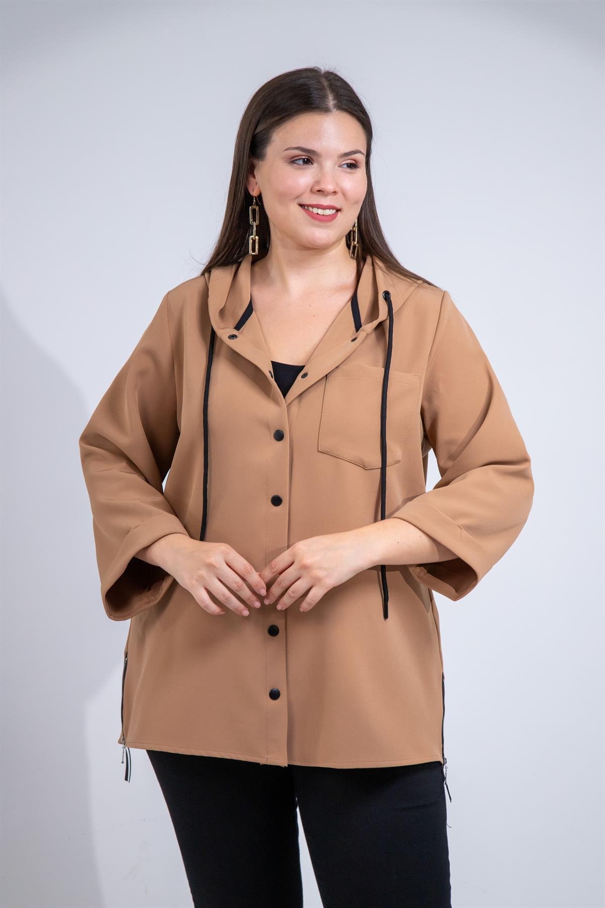 Büyük Beden 1212090 Yanı Fermuarlı Kapüşonlu Ceket Camel